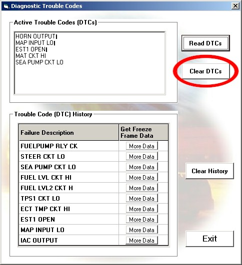 Clearing Trouble CodesClick the button indicated to clear (or erase) the active trouble codes. If the error condition is still present, the code may not clear, or immediately clear then shortly reappear.