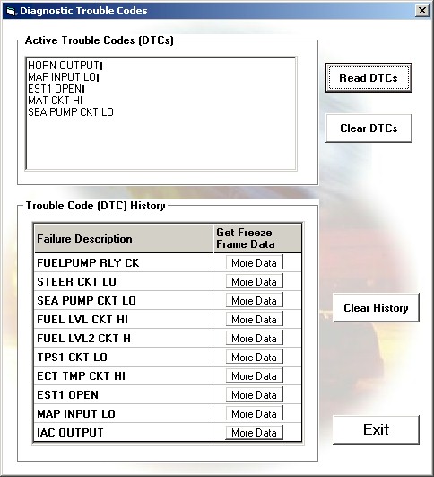 The Trouble Codes item allows you to read and clear active Diagnotic Trouble COdes (DTCs). It also displays the stored codes