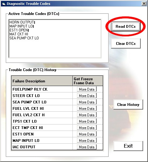 The section at the top is for active trouble codes. The section at the bottom is for stored trouble codes. Reading Trouble CodesClick the Read DTC button as indicated.